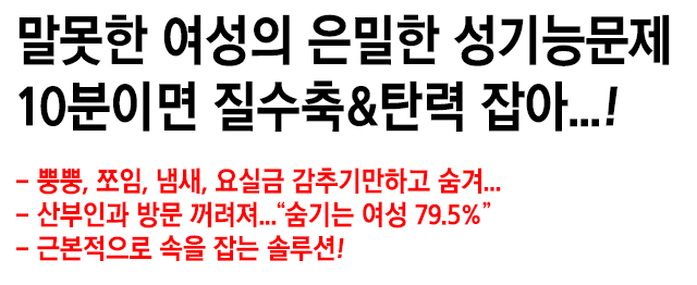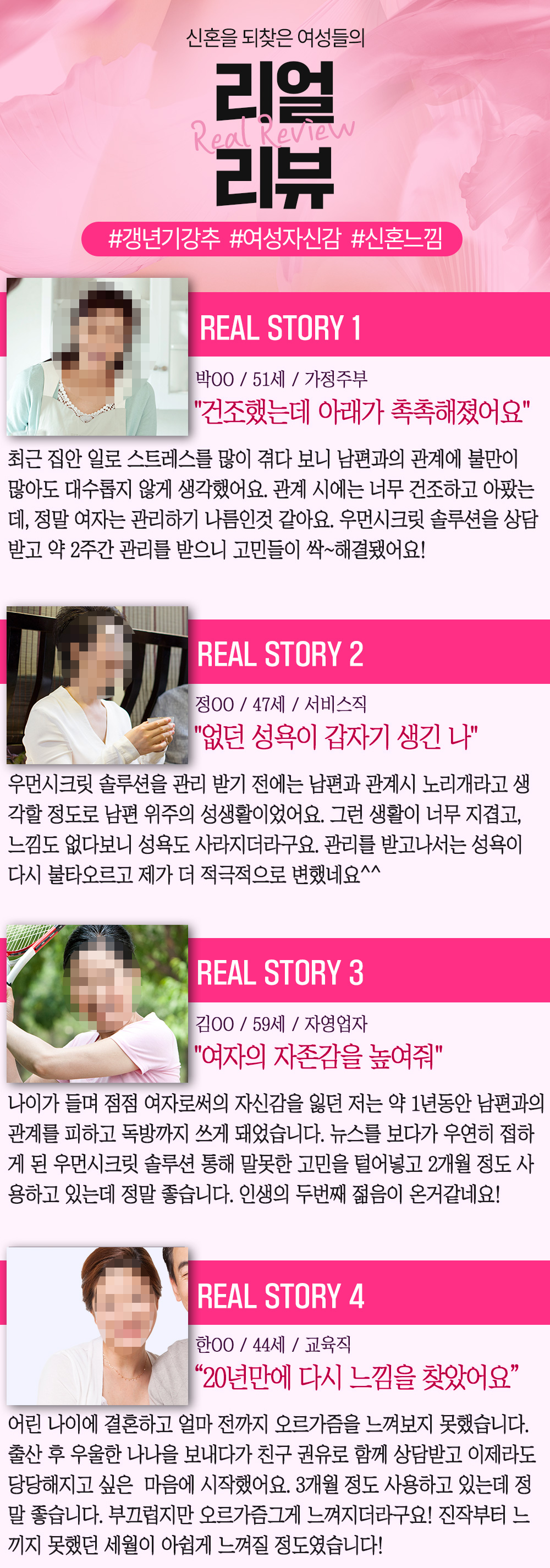 꽃다운 나이가 지면서 나이를 먹을수록 늘어난 질근육과 냄새가 나며 성교시 오르가즘을 느끼지 못하고 잦은 통증 문제로 박미정(42세)씨는 어디 가서 이야기도 못하고 상담하기 어려운 부분이라 더욱 고심은 커져갔다. 그러던 중 “우먼시크릿 솔루션”을 통해 수술없이 2주면 수축력이 강화되고 질 내부의 건강을 도모 했다는 비슷한 연령대에 있는 수많은 여성들의 후기를 볼 수 있었다.
