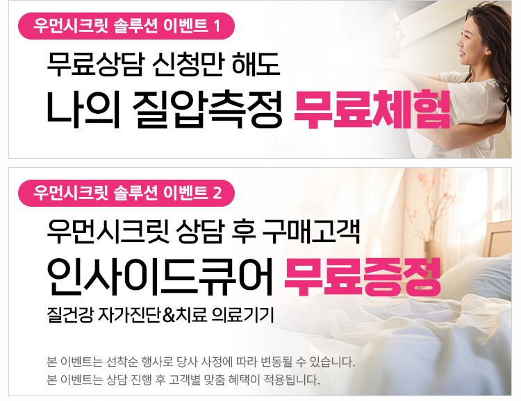 우먼시크릿 솔루션은 오늘까지 상담신청 고객 한정 간편히 나의 질압을 체크할 수 있는 무료 체험 이벤트를 진행 중이며, 상담 후 구매하는 고객에게는 선착순 사은품 증정+ 시크릿 추가혜택 이벤트를 진행중이니, 이번 기회를 놓치지 않기를 바란다.